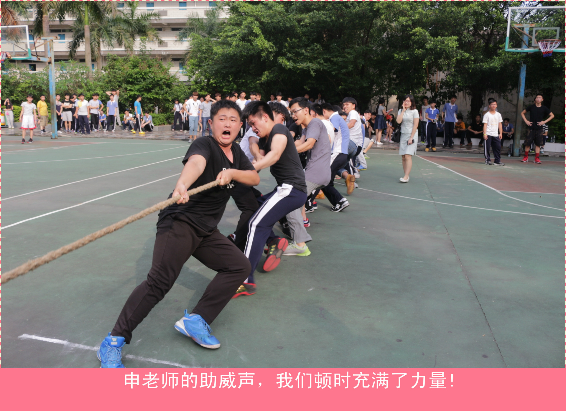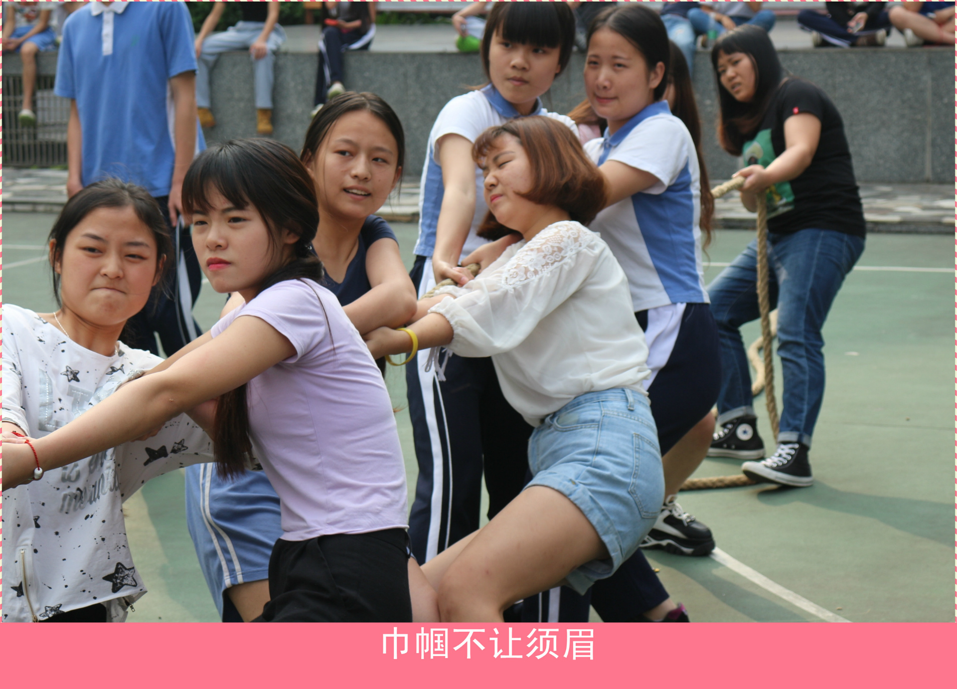 每一场比赛,凡是参与的同学,没有一个不是拼尽全力的,被拉倒了再爬起来,手磨破了咬牙坚持,为了班级的荣誉,每位同学都发出了属于自己的怒吼声,周围同学们虽没有参加,却也奋力地为自己的班级加油助威,把比赛的气氛一次又一次的推向高潮。