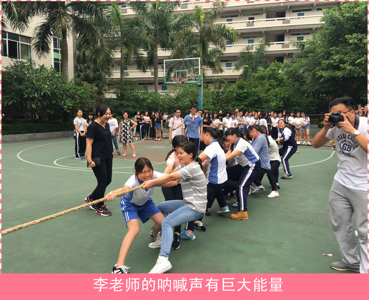 在学校篮球场,来自每个班级的队伍展开了激烈的角逐,比赛异常紧张激烈。每位参赛队员都全力以赴,场内外人员的心都为了长绳上那小小的红线而紧张!热情的啦啦队在场外高喊着“加油!加油!”,震耳欲聋的助威声此起彼伏。每场比赛都牵动着老师们的心,呐喊声中师生的心贴得更紧了。