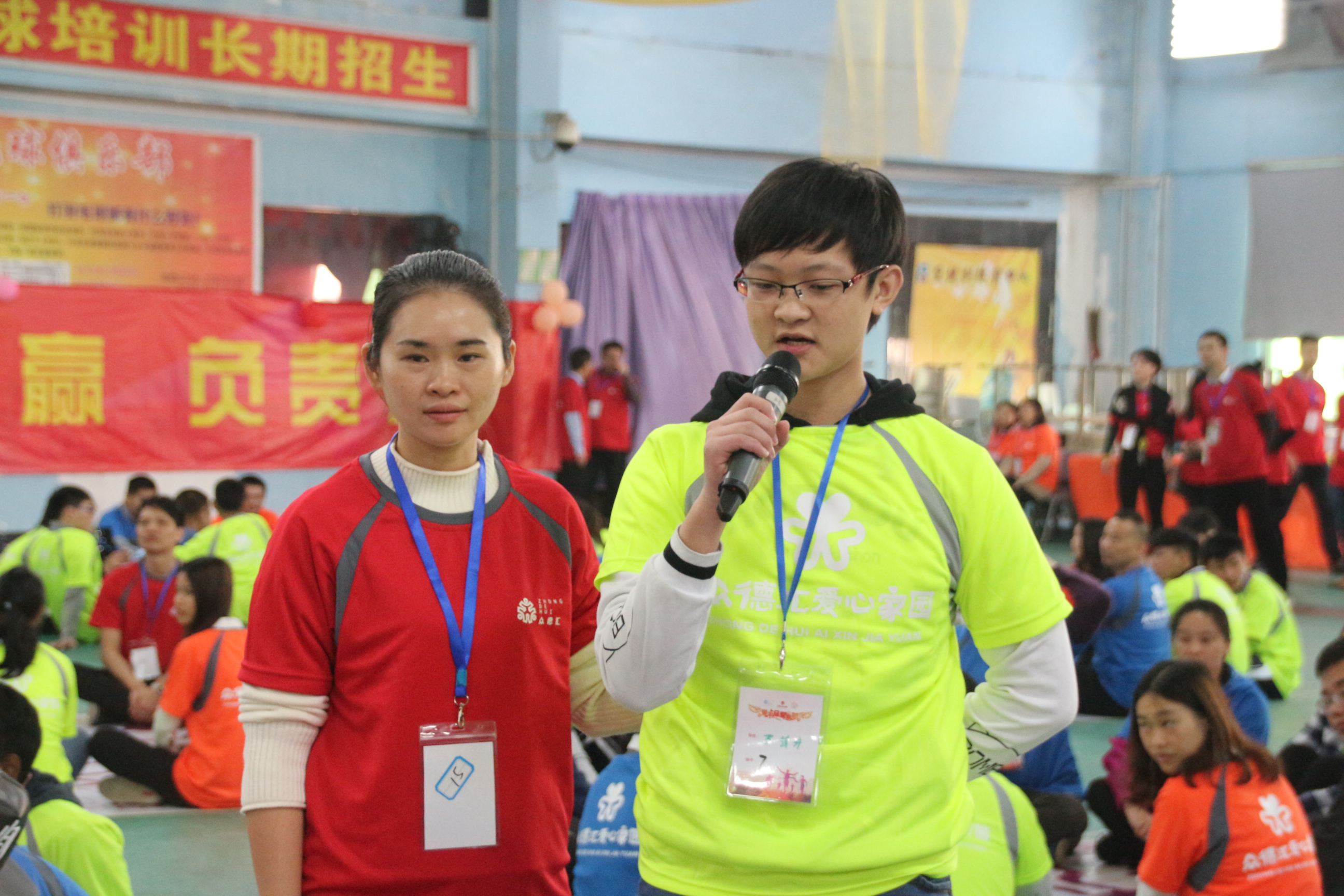 上午8时,来自深圳、广州、珠海等各省市众德汇ta11公益团队的数十名义工和深德技工学校的200余名学生、家长、老师身着绿色、蓝色、黄色上衣鱼贯入场“齐集”在会场内,谈笑风生,一派喜气的景象。伴随着动感欢快的乐声,活动的体验式学习之旅正式拉开帷幕,整个会场顿时沸腾起来,处处充满了温情与真诚,时时洋溢着感动和震撼。参与活动的老师、家长放下了平时的身份和孩子成为亲密无间的伙伴。在互动环节,义工们将所有学生、家长和老师分成16个小组,他们和孩子们、老师们一起兴致勃勃的参与到小组创建,感悟游戏中所蕴涵的团队精神和沟通理念。