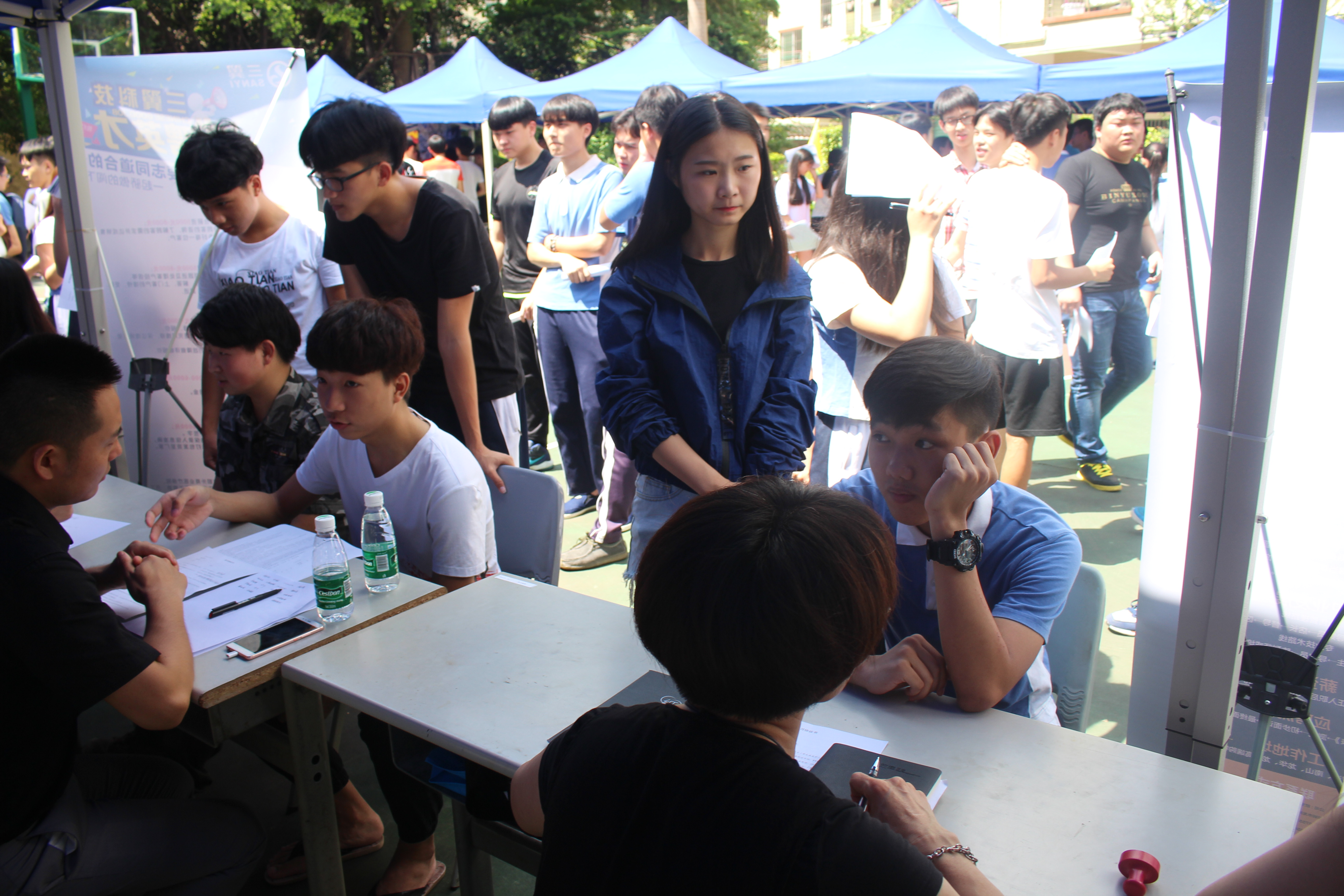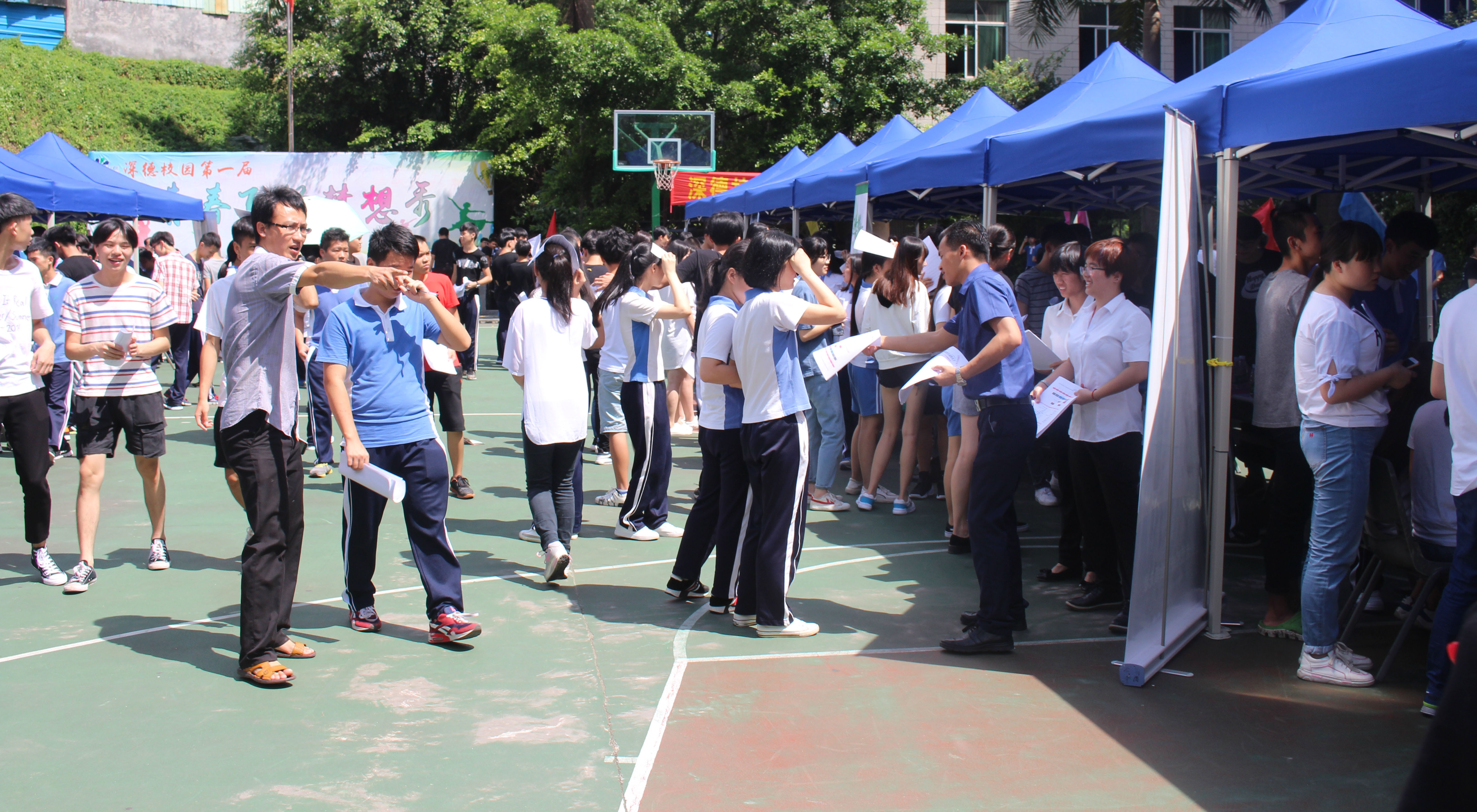 顶着六月的骄阳,手拿漂亮的简历。为了给学生创造一个和企业近距离接触的机会,搭建一个为学生实习工作的平台,6月26日上午,深德技工学校东校区校园招聘会在学校操场举行。