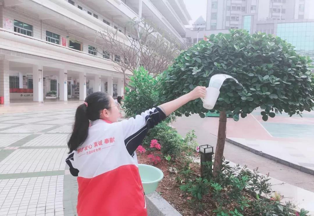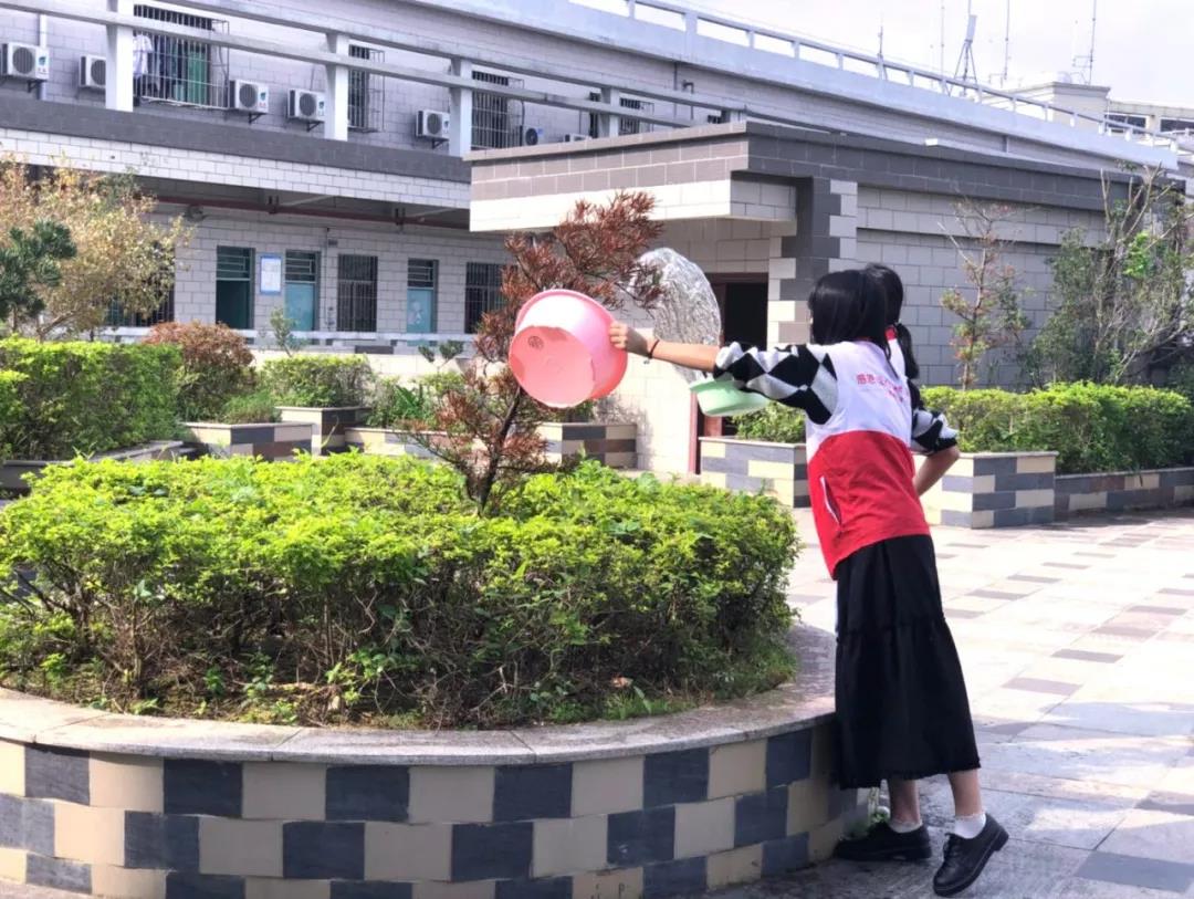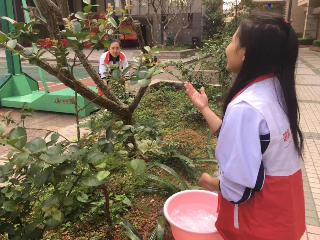 我们给树木花草浇水,它们陪伴着我们学习生活,我们爱护它们,我们把学校的一草一木当成自己的一样呵护。我们在做自己,为学校的建设描上浓浓的一笔。