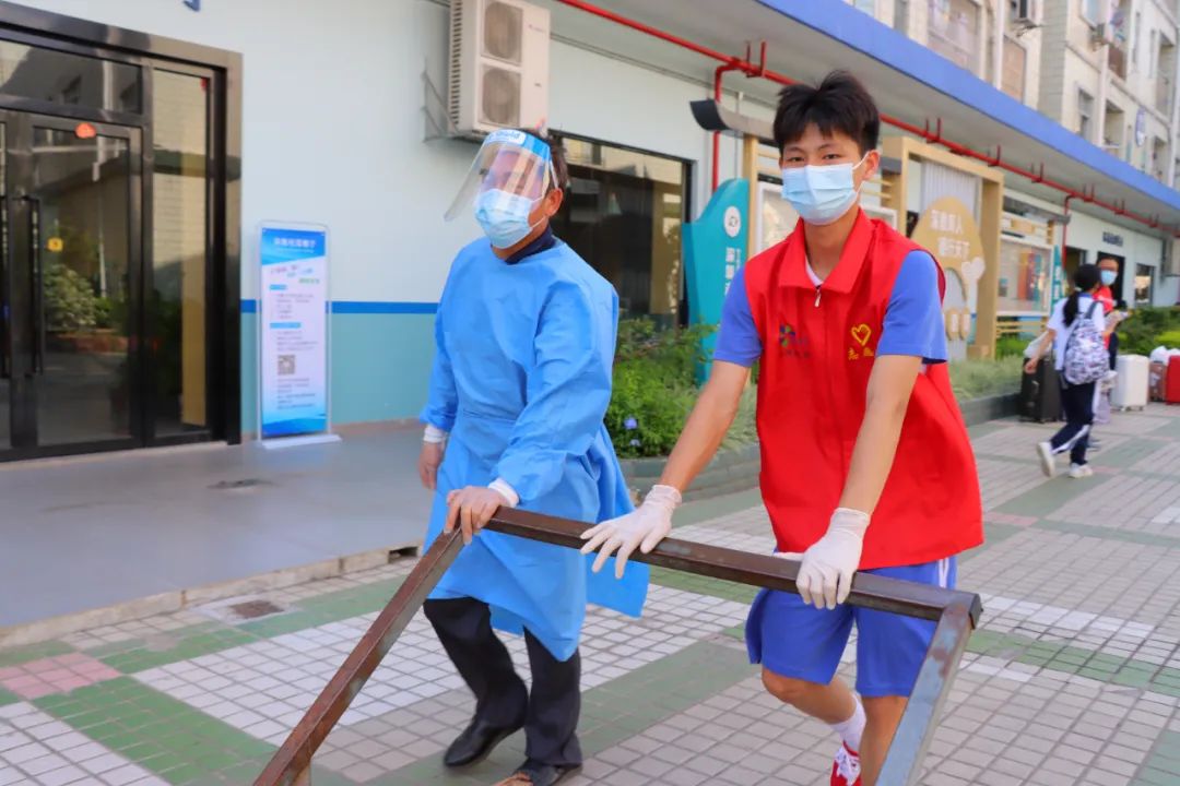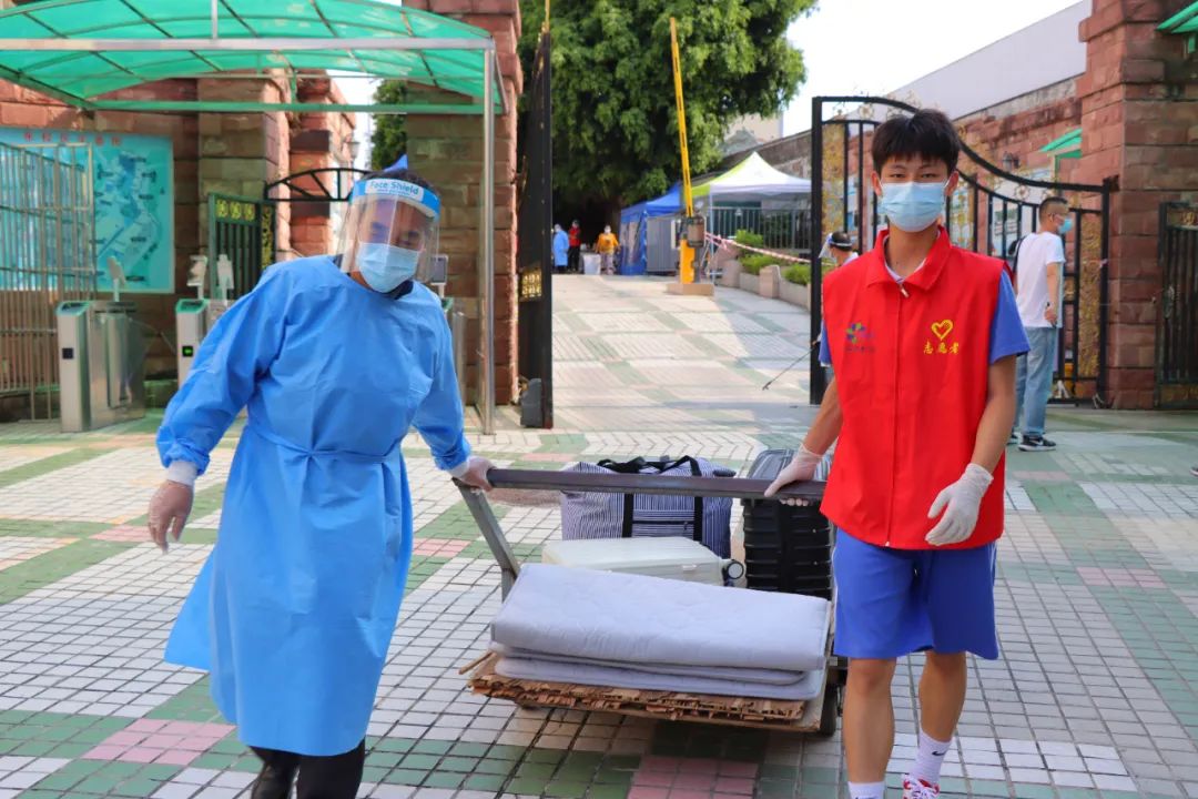 我校组织学生分批错峰有序返校,4月25号第二批学生返校顺利结束,踏入校门是不是有点小激动呢,为了迎接大家的到来,学校可是在门口设置了多重防护哦,今天有学校党支部志愿者和老师继续参与接待,同时学校义工社的学生志愿者也参与协助返校学生进行搬运行李!请放心回来,欢迎回家~