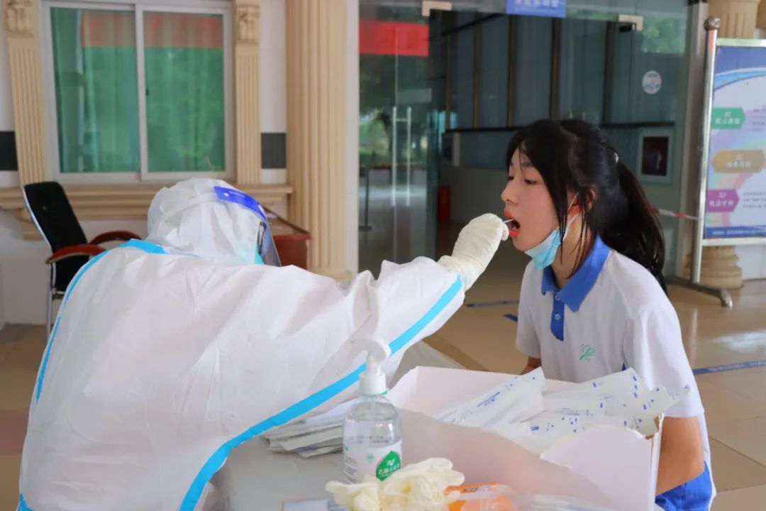 学校对返校的同学统一进行核酸检测,校园核酸采样现场,同学们间隔1.5米,在志愿者的引导下有序排队,现场工作人员认真负责地为同学们进行检测。学校醒大家:同学们回到学校后也要注意个人防护,戴好口罩,减少聚集,即使疫情形势好转也要保持警惕,不能掉以轻心。