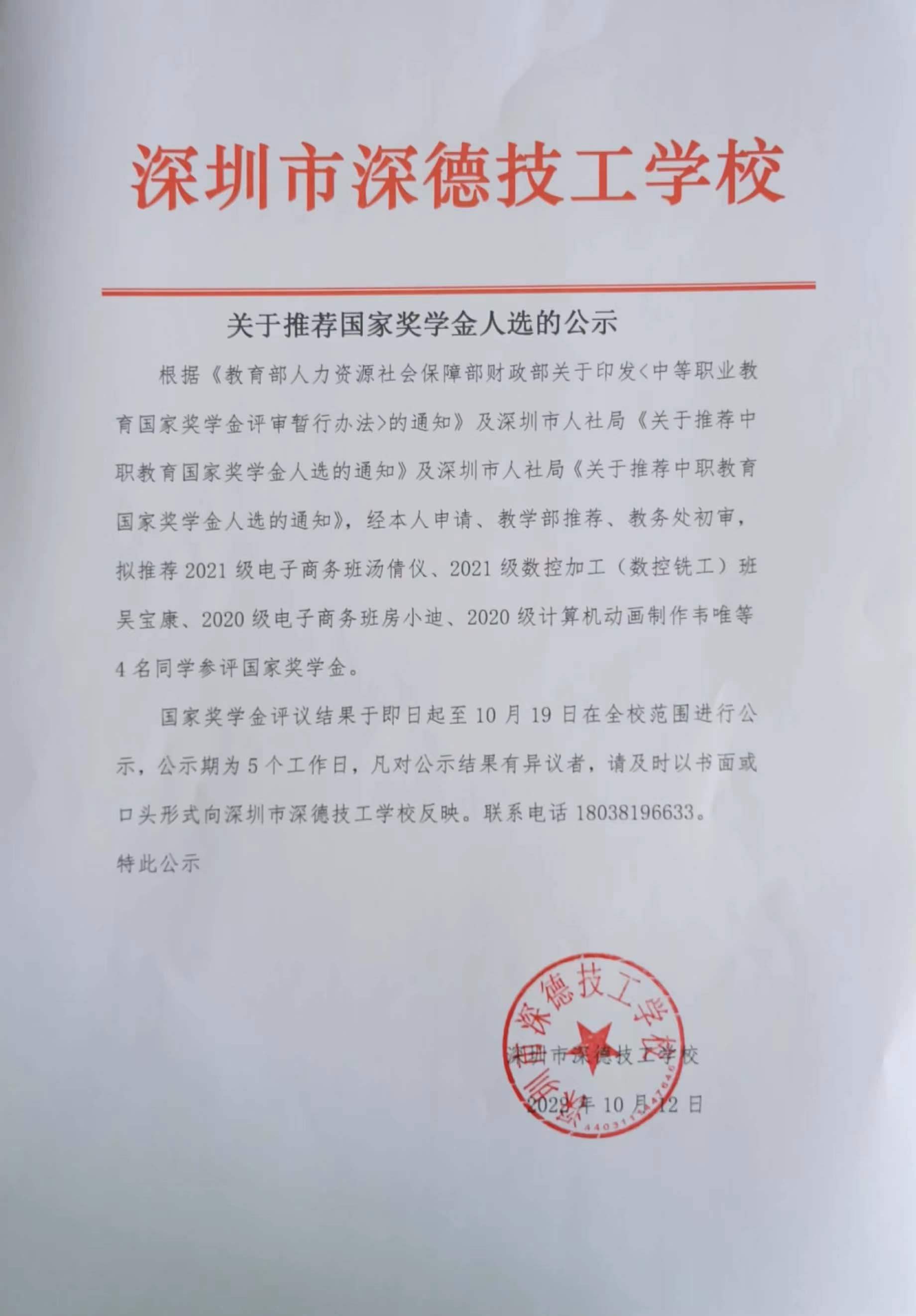 深圳市深德技工学校 关于推荐国家奖学金人选的公示