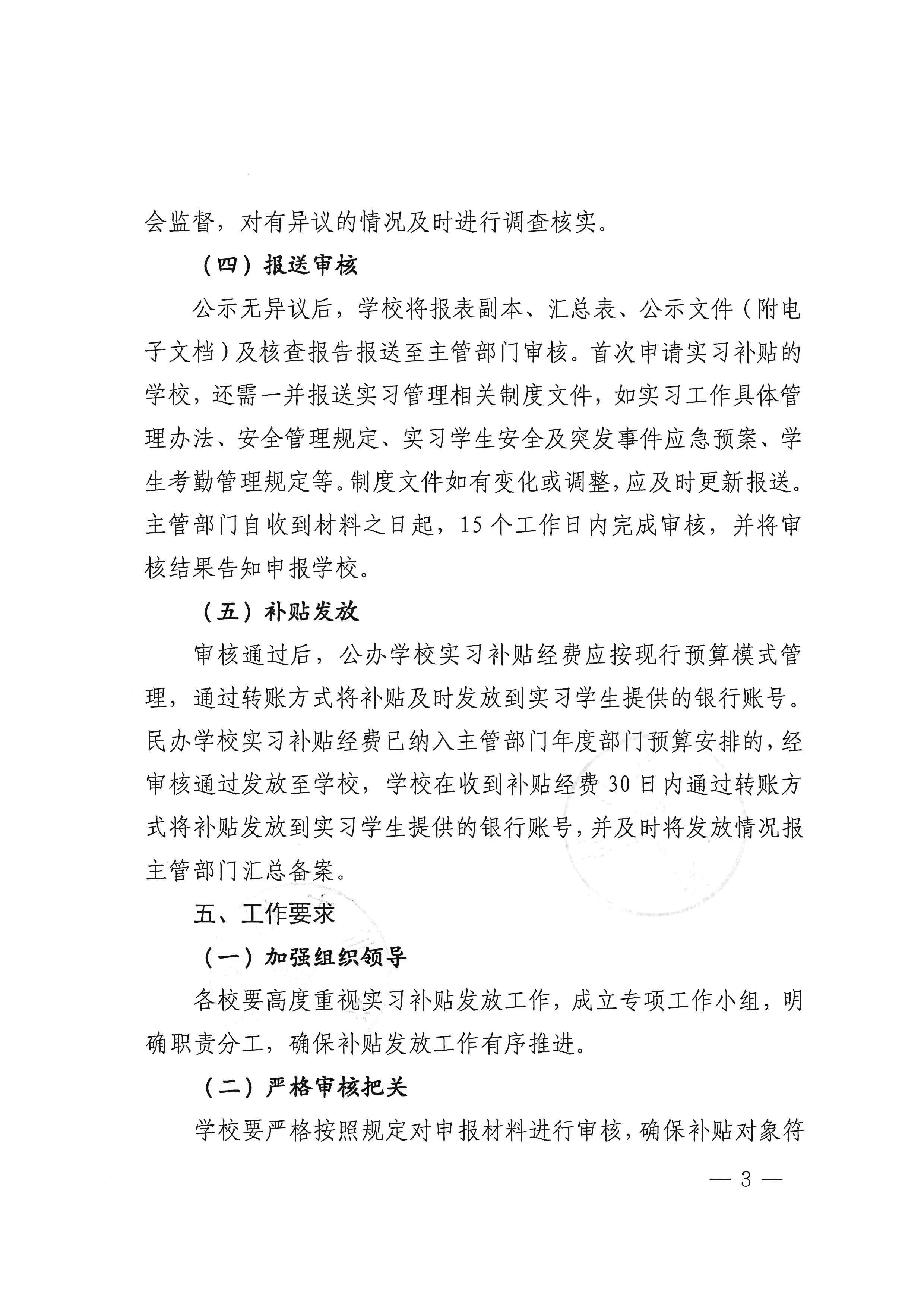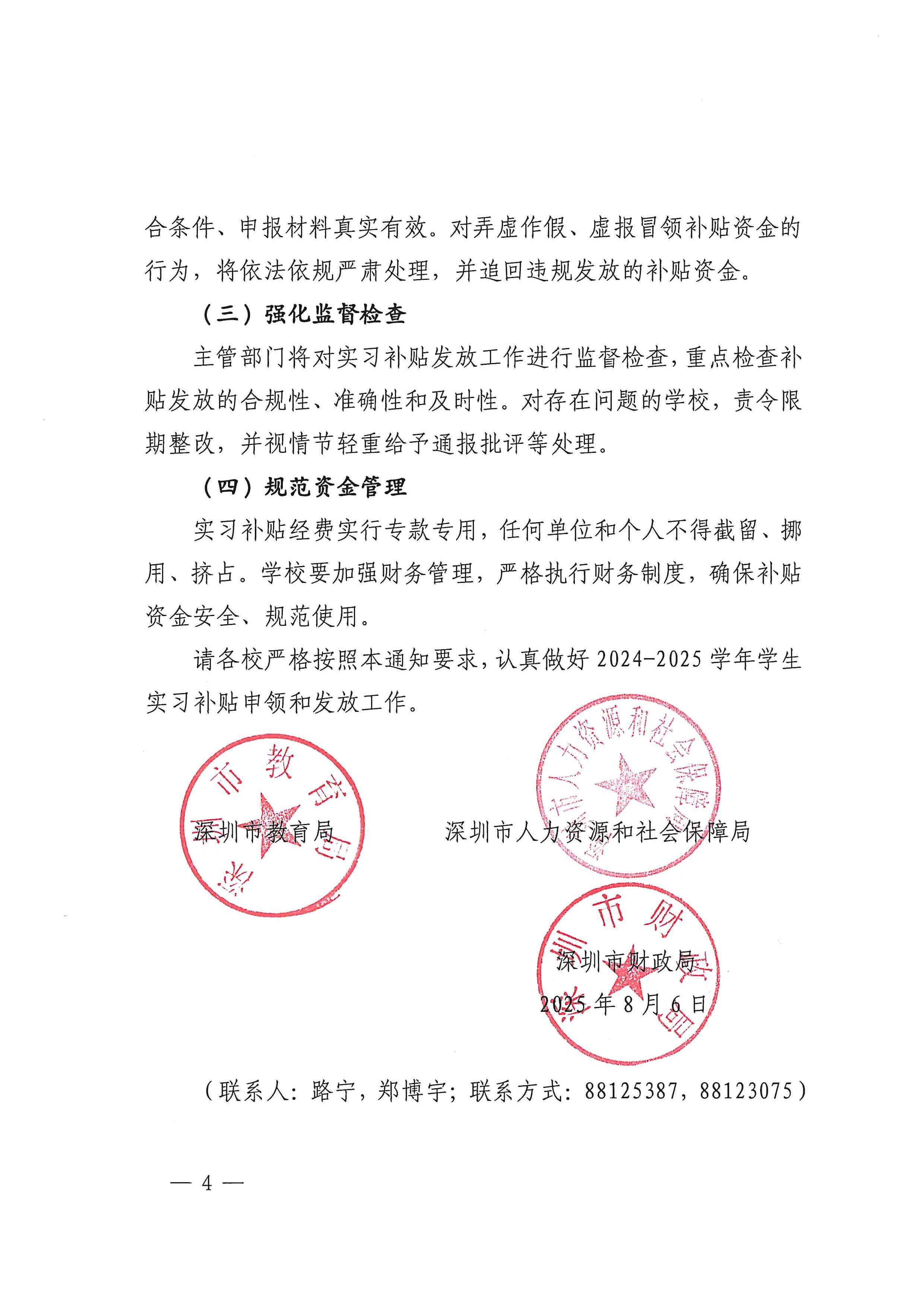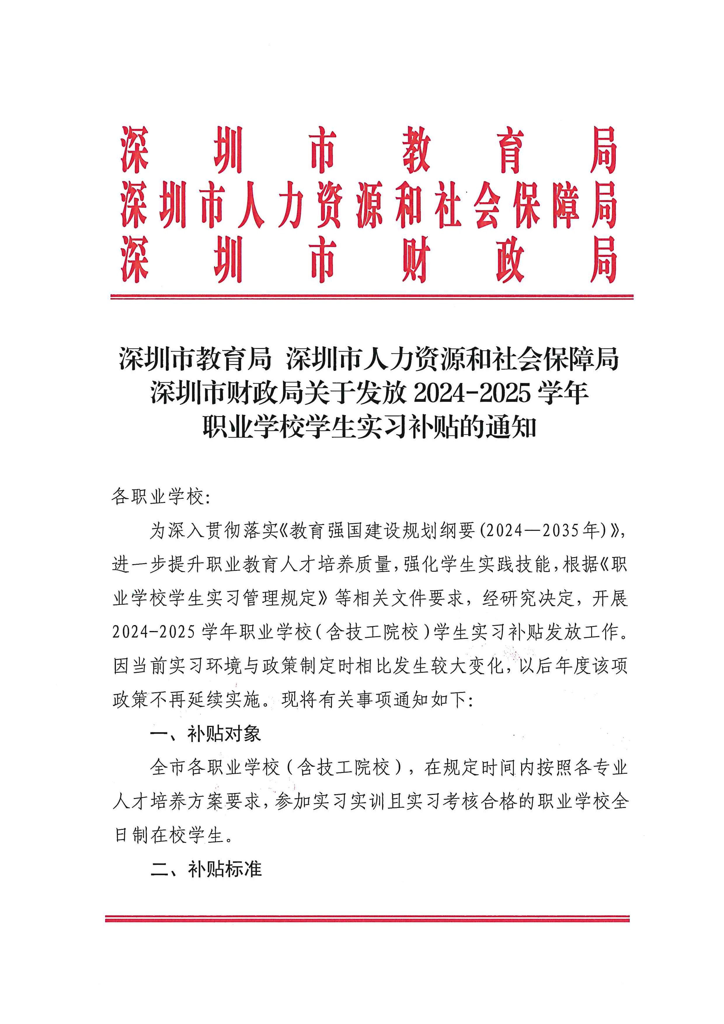 深圳市教育局 深圳市人力资源和社会保障局 深圳市财政局关于发放2024-2025学年职业学校学生实习补贴的通知