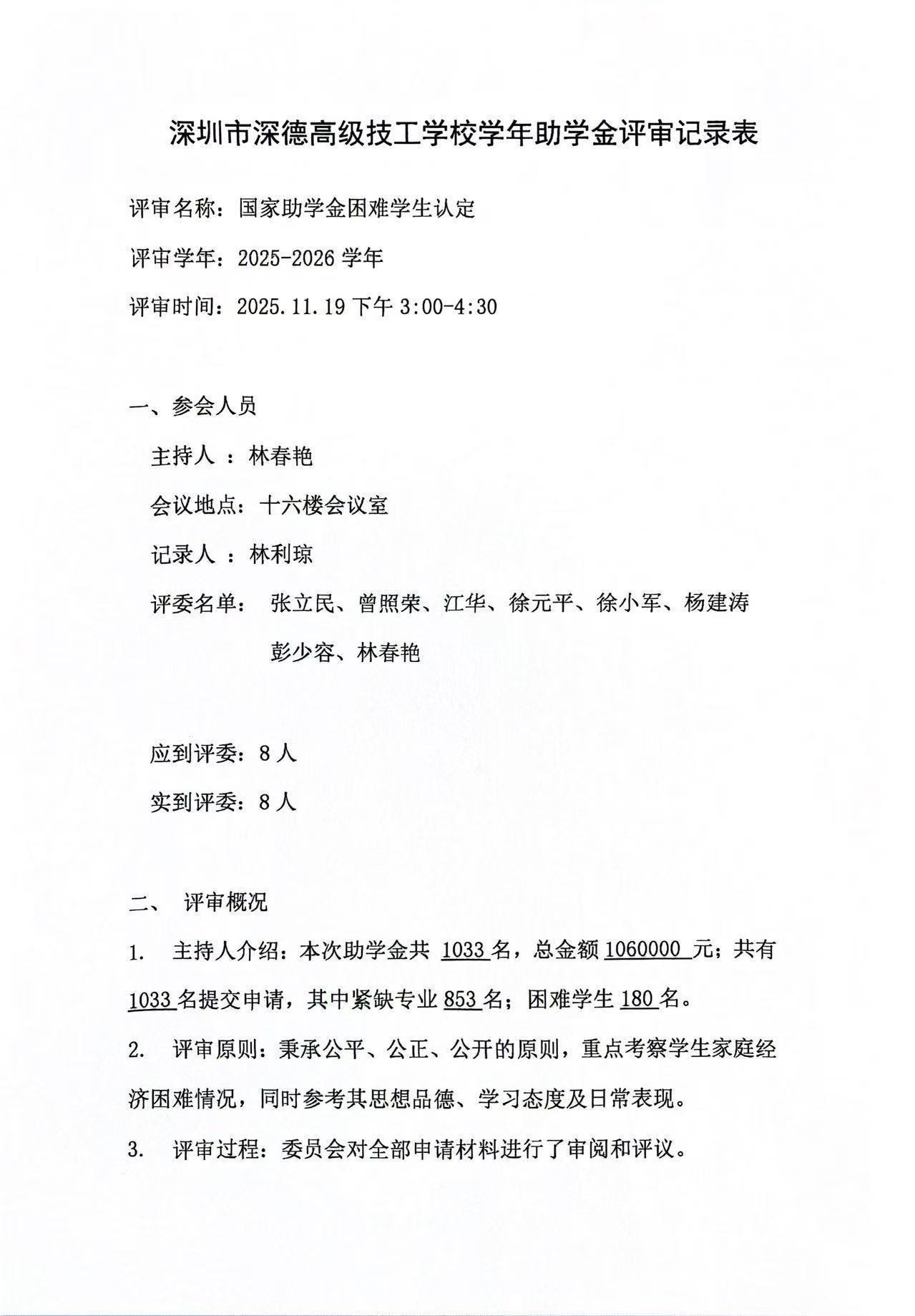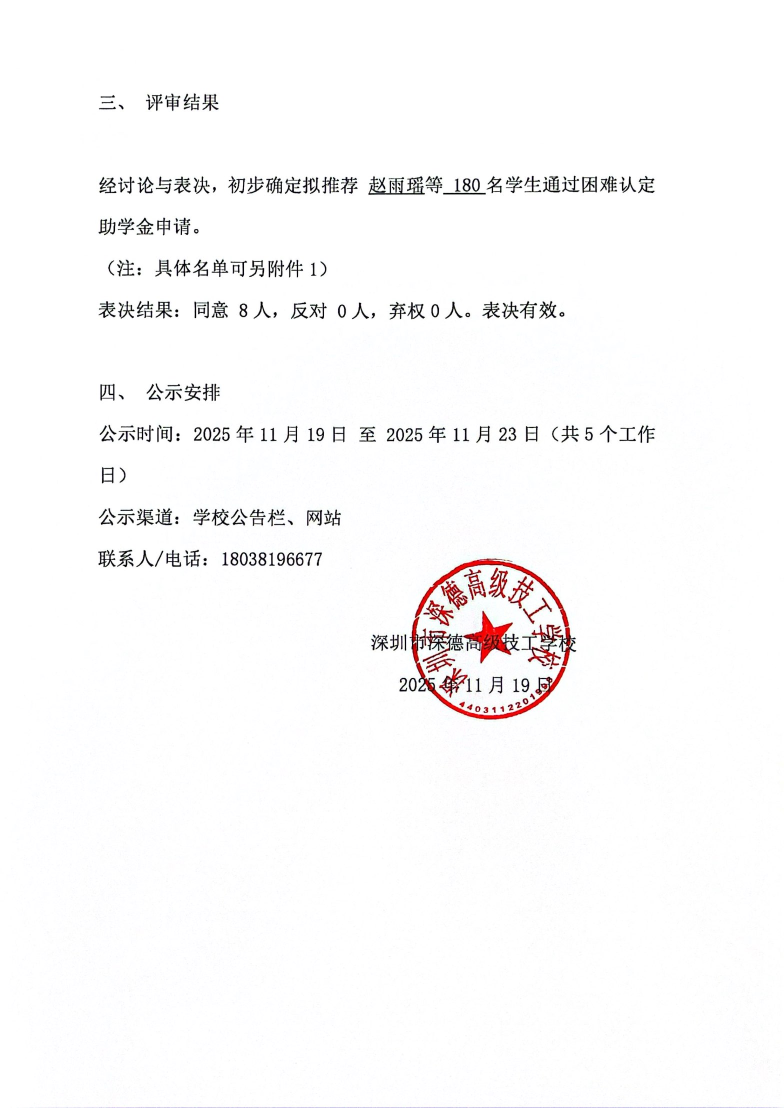 深圳市深德高级技工学校2025-2026学年困难学生认定名单公示