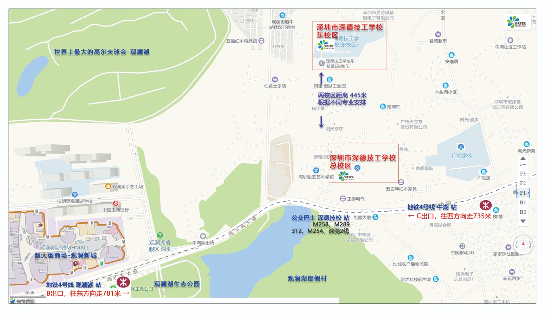 公交:312路、M258路、M289路、B878路、B921路 到深德技校站 > 步行导航100米到校
